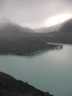 Once we got to the end of the track we hiked up the glacier wall to look at the ice. It was incredible. It’s hard to get a sense of how big it actually is because the mountains dwarf it, but it’s 2 km wide and sticks up 100-200 meters about the turquoise lake at its end. There are icebergs floating in the lake, remnants of pieces that fall off the glacier periodically. The ice is covered with a layer of gravel, which is essentially nature’s way of keeping the ice cold, so you see a mixture of blue ice and dark grey stone.